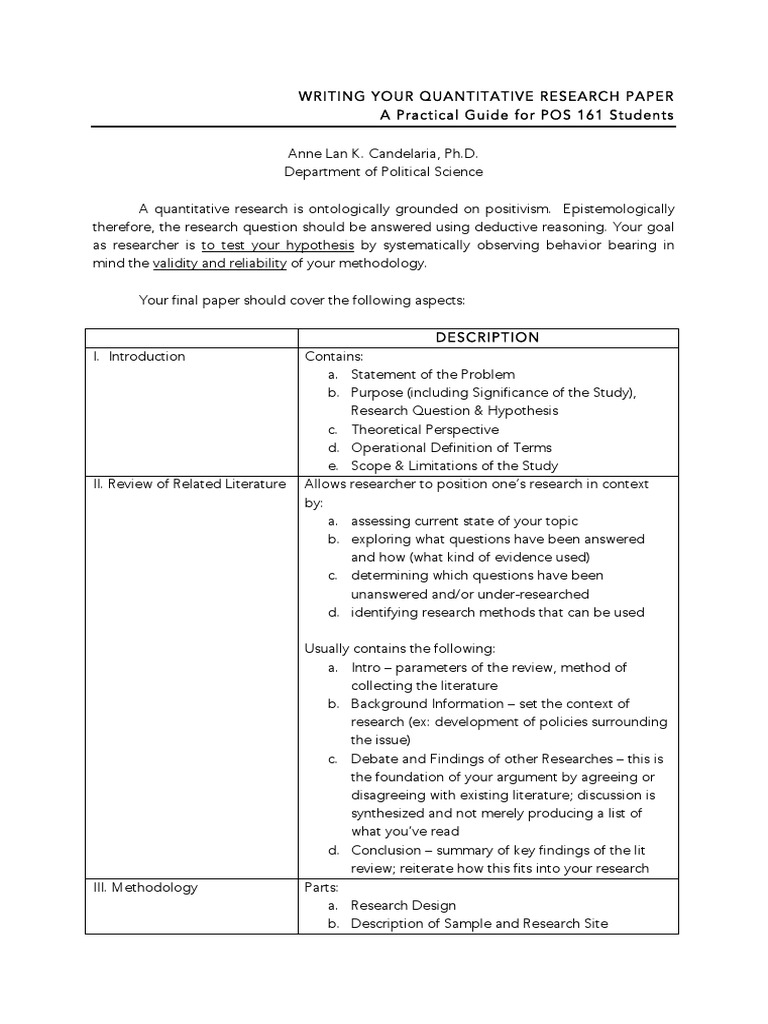 Qualitative and quantitative foe example the midwifery study was indirectly controlled by the researchers whose main involvement, other than randomly allocating mothers to either the controlled or. The research paper should follow the basic elements of a novel research project, in that it should address a specific research question, briefly identify the theoretical contribution, provide testable hypotheses, and implement a suitable design based on one of the methods that we study in the course. For example, a chocolate brand may run a this is the most common way to collect quantitative data. Compare your paper with over 60 billion web pages and 30 million publications. An integrated approach to research design, measurement and statistics. Different types exist but overall they help: Moreover, a quantitative approach and quantitative approach or research are focused on the systematic process, so that information. You can utilize factual programming, for example, stata or spss. Qualitative and quantitative methodologies 1 communication research methodologies: In order for any quantitative research method to work, one must first establish the baseline of what will be analyzed. Summarise the literature relating to a specific topic. For example, will a certain widget. Your methodology can be strengthened by reference to existing research in the field, either to: